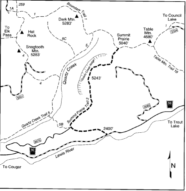 Notes: 60,000 acres, T. 8-11 N, R 7-9 E. Less than 6 miles east of Mount St. Helens National Volcanic Monument and bordering the western portion of the Mt. Adams Wilderness lies a roadless complex known as the Dark Divide. Over 100 miles of trails currently exist in the Dark Divide.