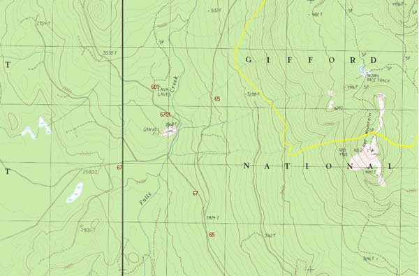 Access: 601 spur, off the 6701 Rd. (R7E, T5N, Sec 1). Near the end of the 601 spur, is a parking area, there are three sections of collapsed tube southeast of the parking area, the southern of these is the main entrance to the cave.