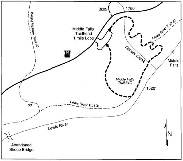 Access: Along Lewis River FR 90 where a short trail leads down to Middle Falls on the North Fork of the Lewis.