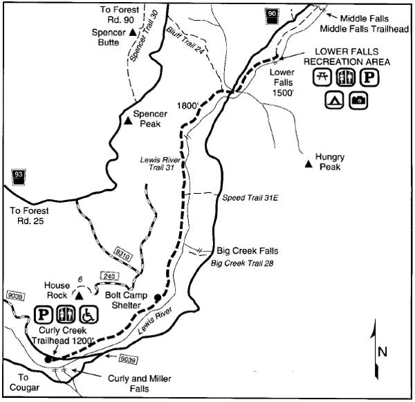 Access: Along Lewis River FR 90 where a short trail leads down to Middle Falls on the North Fork of the Lewis.