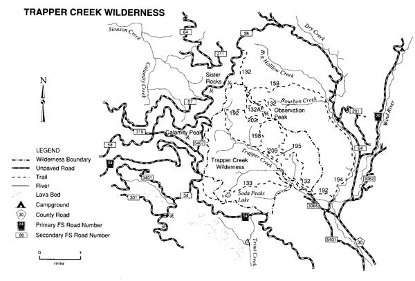 Access: South - Trapper Creek Trail #192 (R7E, T5N, Sec 31) or North - Road 58 (R6E, T5N, Sec 3).